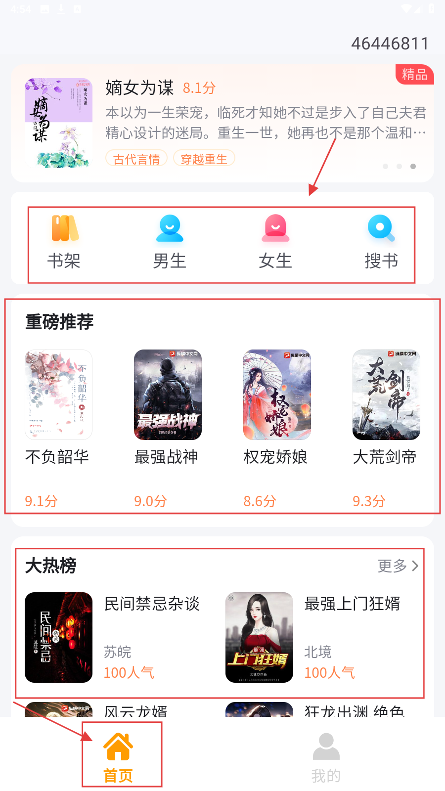 1、打开APP进入首页,有【书架】【男生】【女生】【搜书】等功能按钮,还有【重磅推荐】【大热榜】等板块。