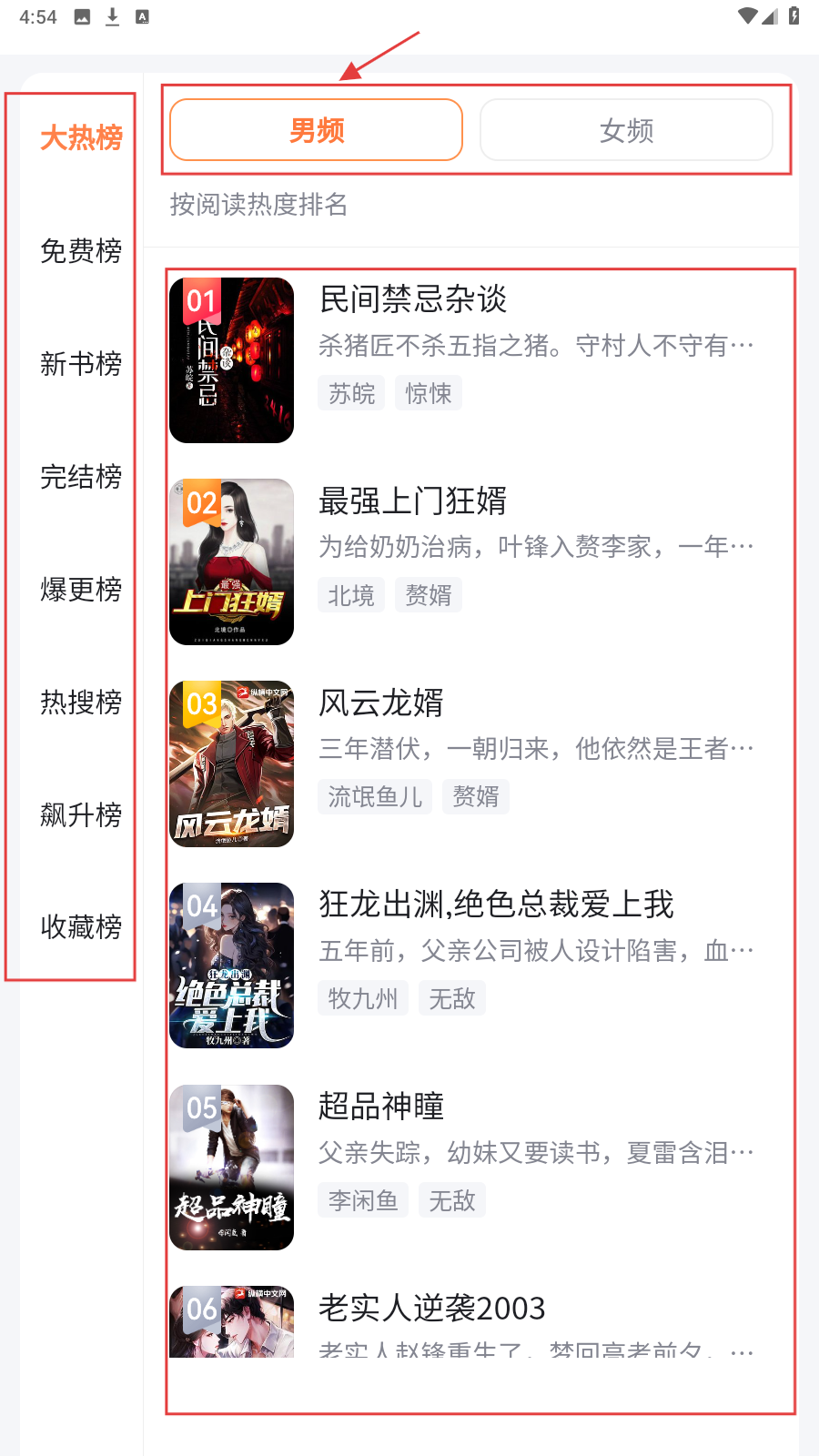 2、点击【男生】或【女生】,进入对应频道页面,有【大热榜】【免费榜】【新书榜】等榜单选项。