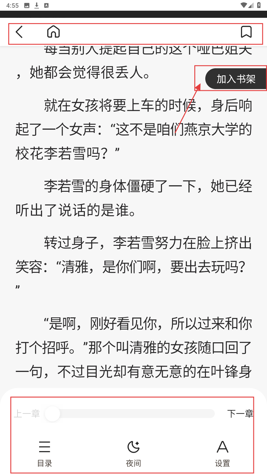 3、选择小说后,进入阅读页面,可查看小说内容,点击【加入书架】,底部有【目录】【夜间】【设置】等功能按钮。
