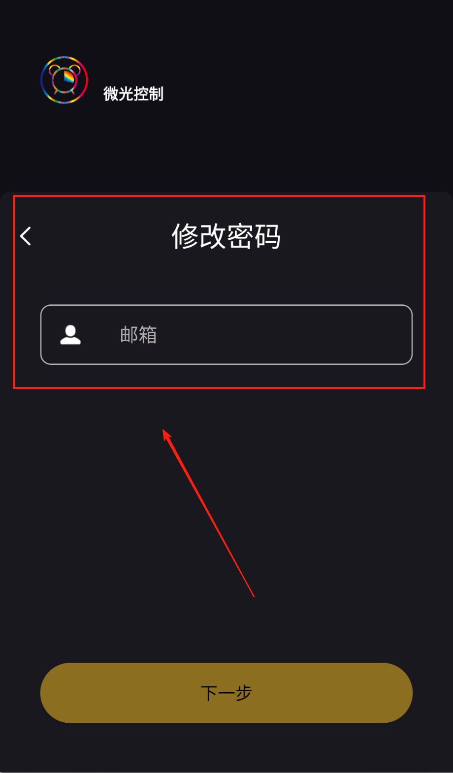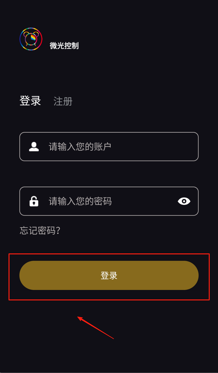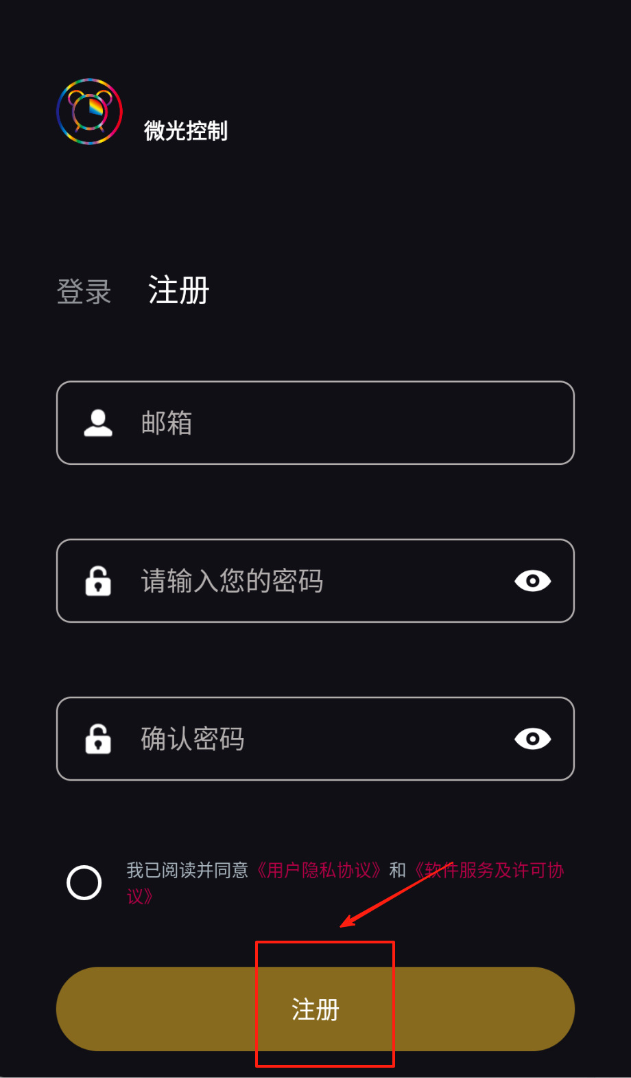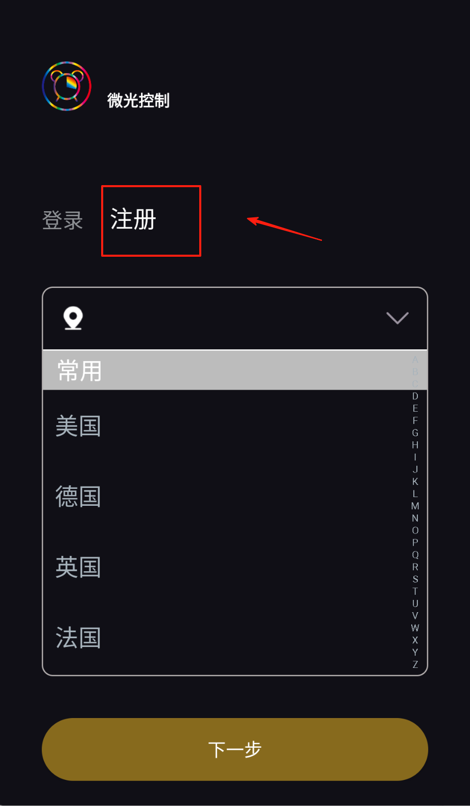 1、打开应用看顶部"微光控制"标志,在黑色背景的登录页,点击注册按钮进入流程,地区选择框可滑动查看各国选项呀。