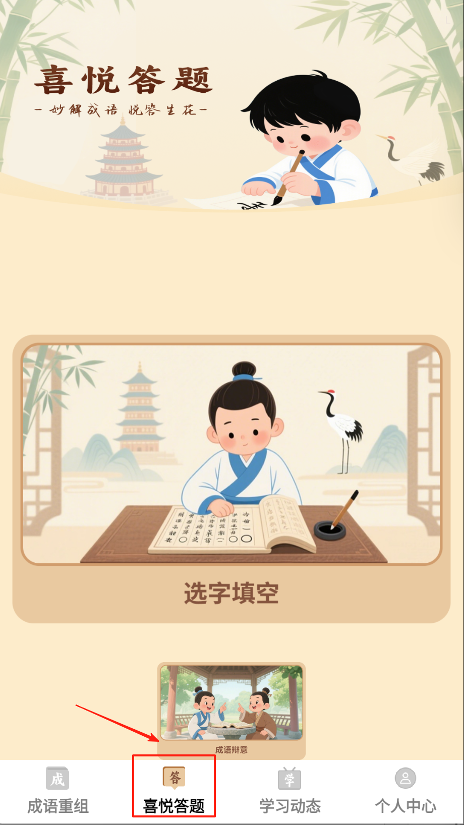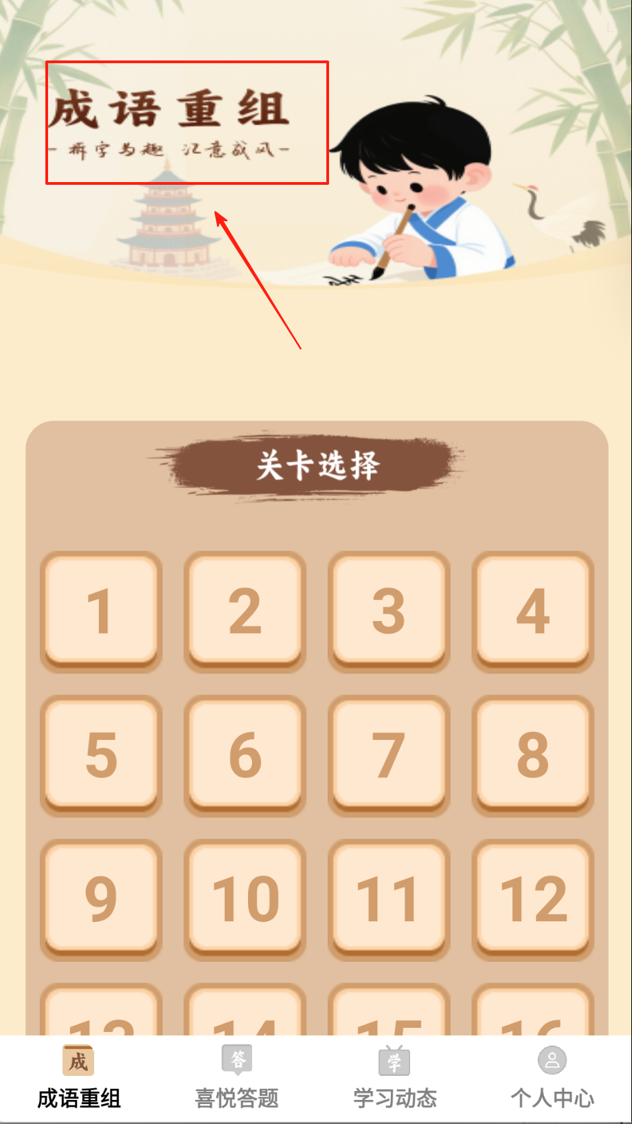 1、首页选"成语重组"开始游戏,红点标注新玩法提醒,收藏高频成语,设置每日学习目标哦。