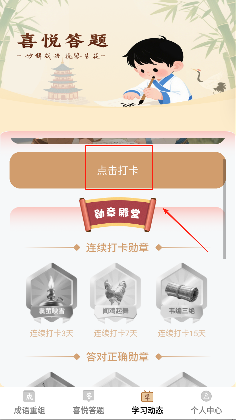 4、社交功能:好友组队成语接龙,成就徽章互相激励,学习动态实时分享,团队目标协作完成啦。
