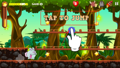 1、进入游戏后,操控小兔子在关卡中移动,躲避障碍、对抗敌人,朝着关卡终点前进,开启冒险征程。