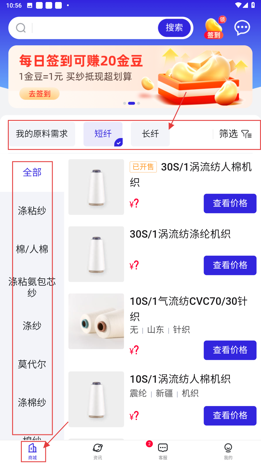 1、打开APP进入【商城】页面,上方有搜索栏可搜商品,还有【我的原料需求】等筛选条件,左侧有【全部】【涤粘纱】等分类选项。