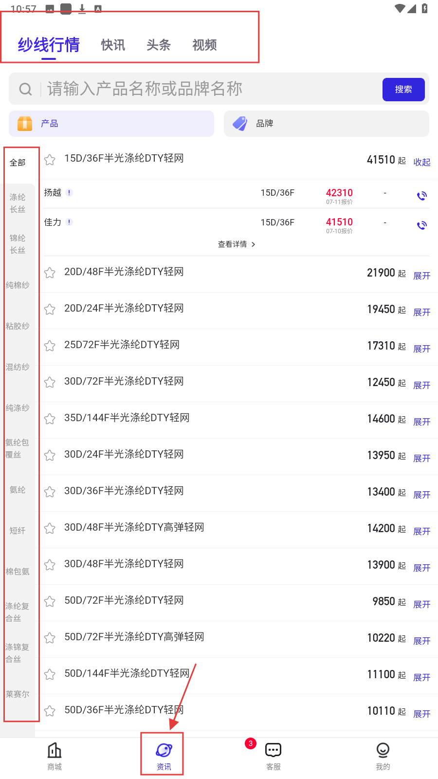 2、进入【资讯】页面,这里有【纱线行情】【快讯】【头条】【视频】等分类标签,可查看相关资讯。