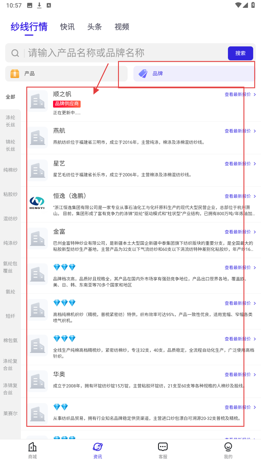 3、选择【纱线行情】标签,进入纱线行情页面,这里有【产品】【品牌】等分类选项,可查看纱线产品的价格信息和品牌供应商信息。