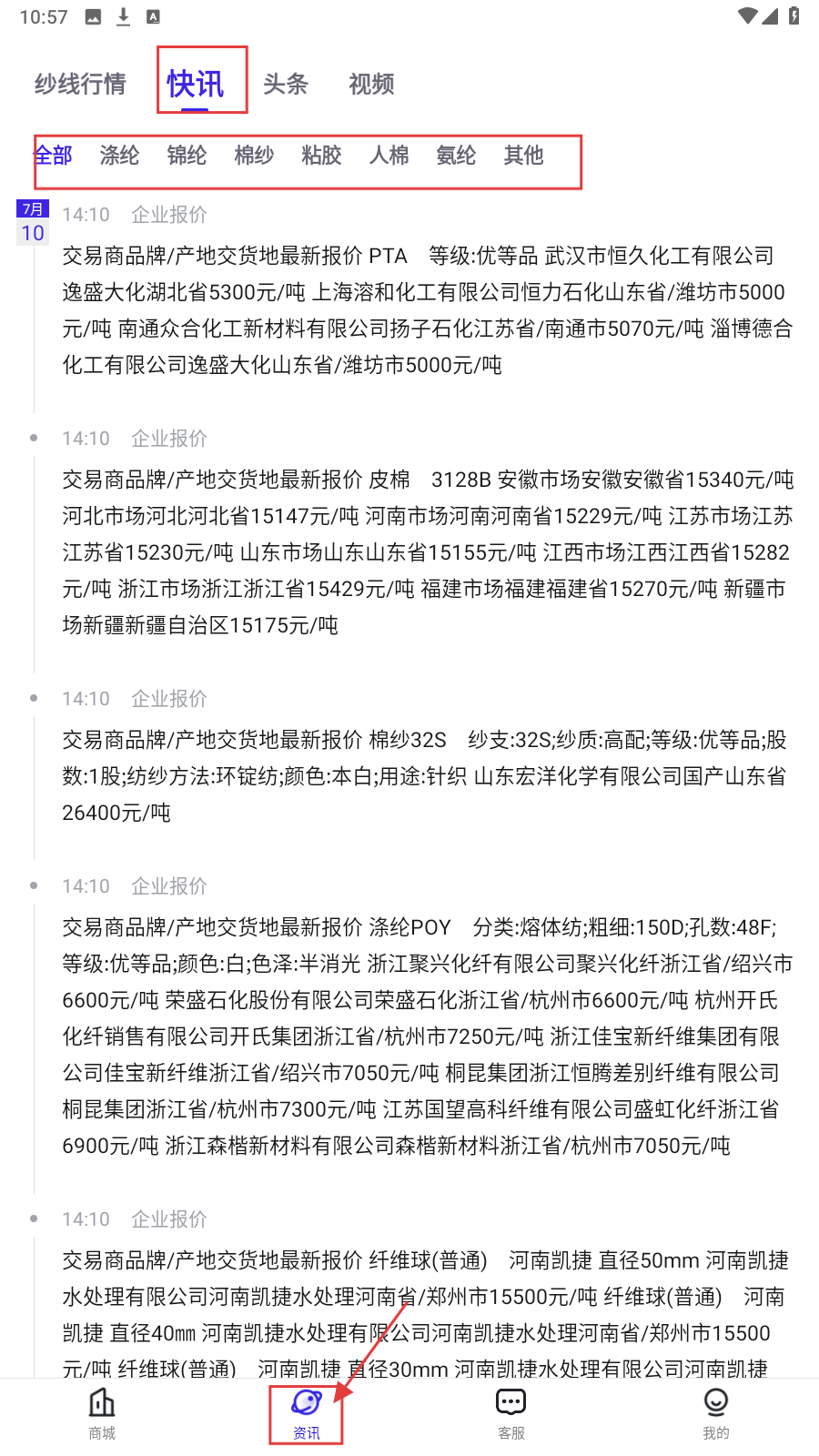 4、选择【快讯】标签,进入快讯页面,这里有【全部】【涤纶】【锦纶】等分类选项,可查看最新的企业报价和市场动态。