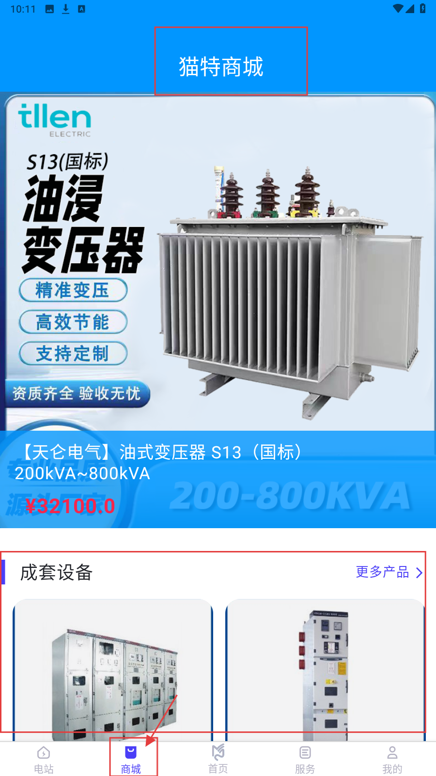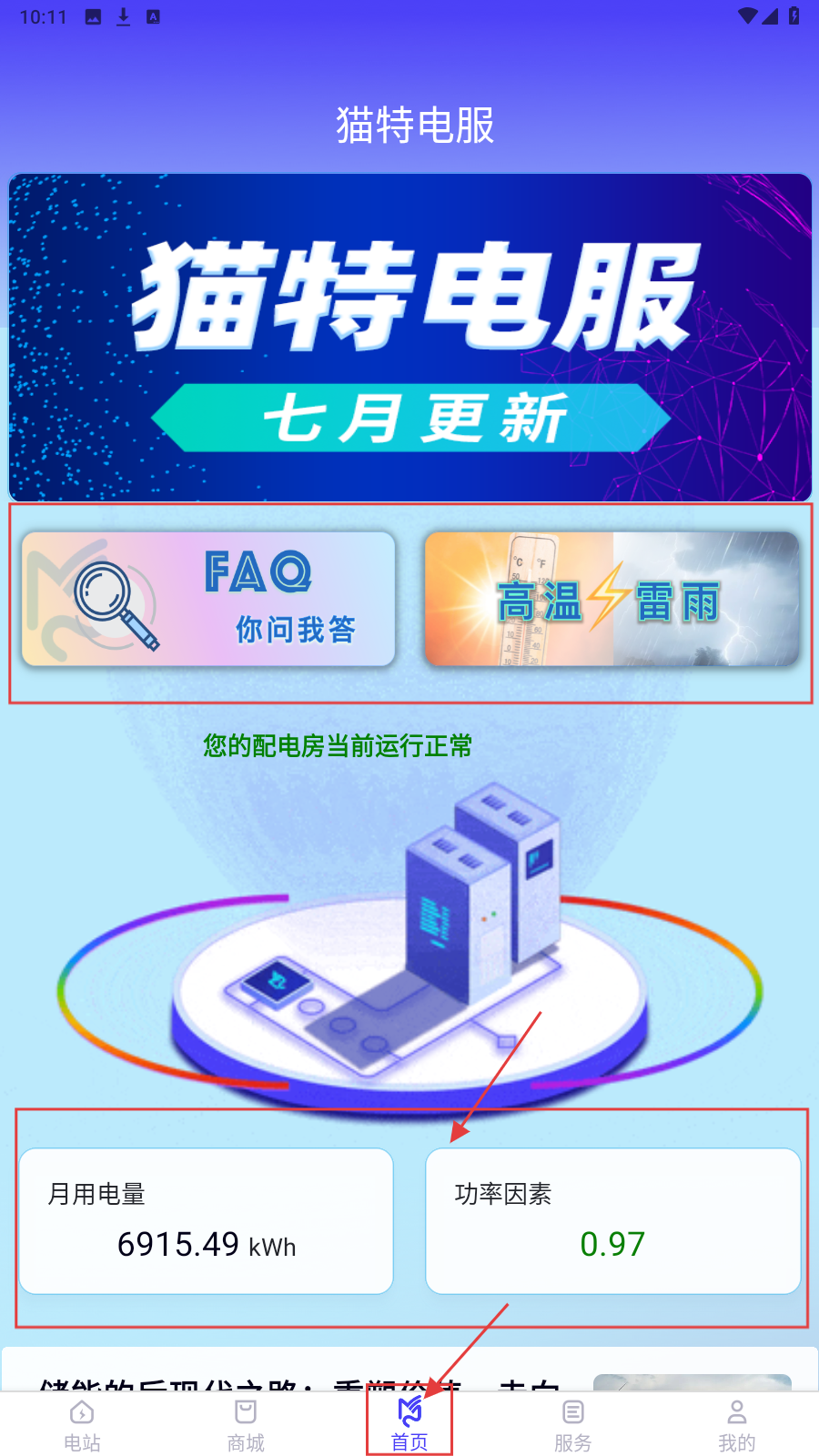 1、打开“猫特电服”应用,在【首页】可以查看【月用电量】、【功率因素】用来观察配电房运行。