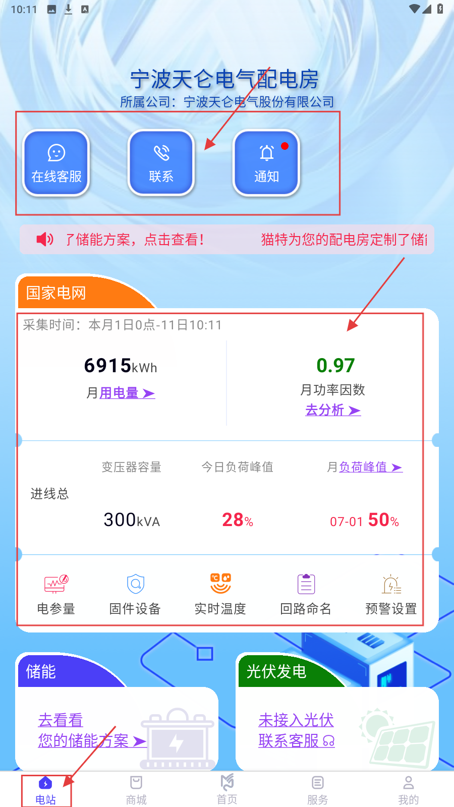 2、点击底部【电站】切换页面,可以使用【在线客服】、【联系】、【通知】等功能,还可以查看【电参量】等。