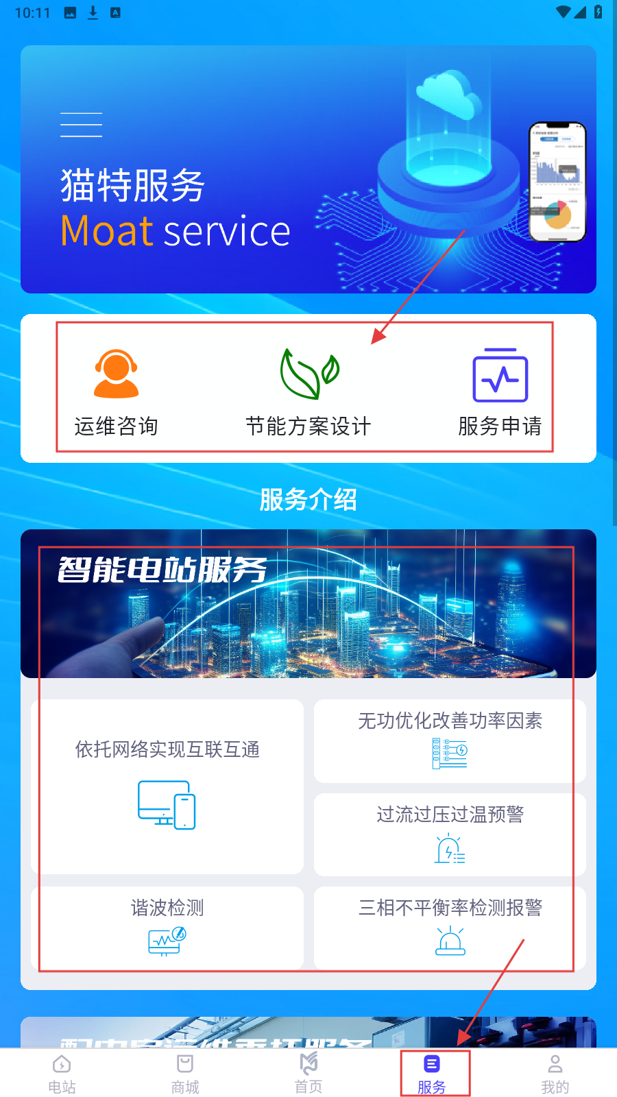 4、点击底部【服务】,可以进行【运维咨询】、【节能方案设计】等操作,还能查看【服务介绍】进行了解。