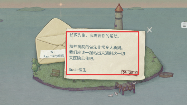 2、发现信件后,仔细阅读【Susie医生】的求助内容,明确任务目标是调查精神病院可疑做法,为后续行动指引方向。
