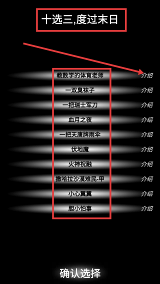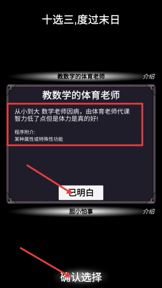 1、面对“十选三,度过末日”时,先点击“介绍”了解各选项特性,如“教数学的体育老师”体力好,可优先选择利于生存的选项。