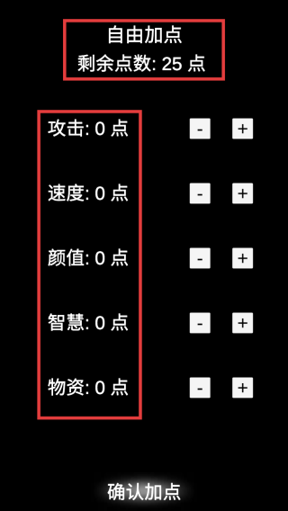 2、在“自由加点”环节,根据末日生存需求分配25点,若侧重战斗可加“攻击”,注重探索选“速度”,前期资源匮乏也可适当加“物资”。