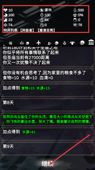4、利用特异列表优势,如【异能者】【眉清目秀】等,结合事件提示推进游戏,适时点击“继续”查看后续发展。
