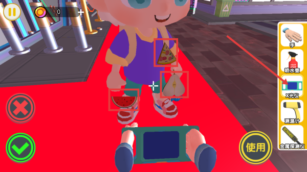 2、点击【使用】按钮操作工具,用【X光仪】查看人物携带物品,判断是否符合规定。