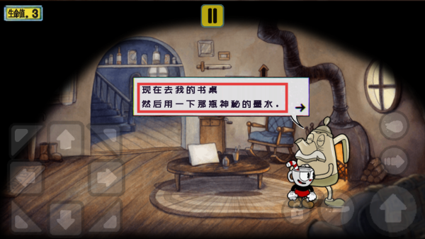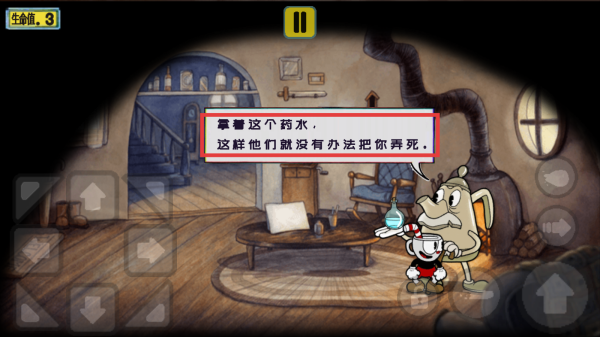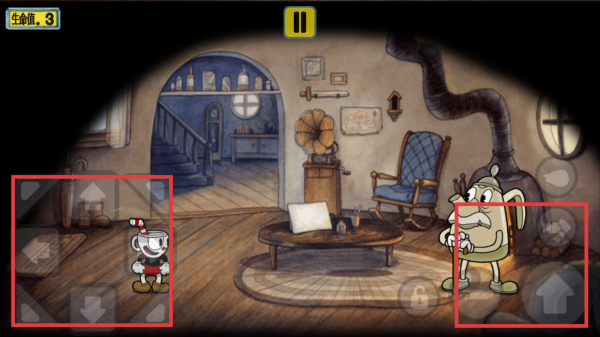 2、利用屏幕左下角方向键控制茶杯头移动,右下角可能为攻击、跳跃等功能键。