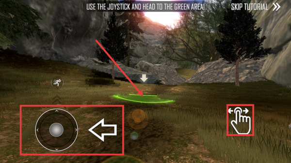 1、根据提示,通过左下角虚拟摇杆控制角色移动,前往绿色区域。右下角手势图标可能用于其他操作,可探索尝试。