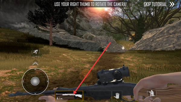 2、看到提示,用右手拇指操作屏幕旋转视角,以便更好观察周围环境。留意武器弹药数量,如“4/∞”表示当前武器弹药情况。