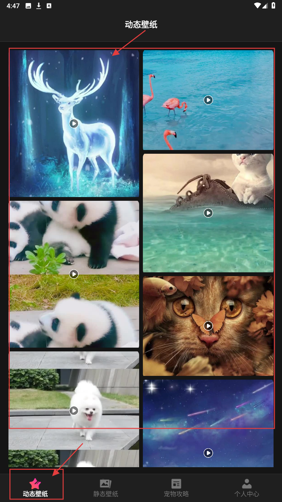 1、点底部【动态壁纸】,浏览含动物、风景等动态素材(如水晶鹿、熊猫视频),选喜欢的查看/设置。