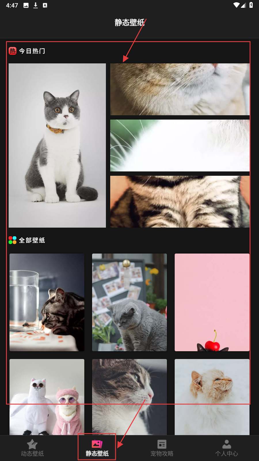 2、切换【静态壁纸】,看“今日热门”“全部壁纸”(多为萌宠、生活场景图)。