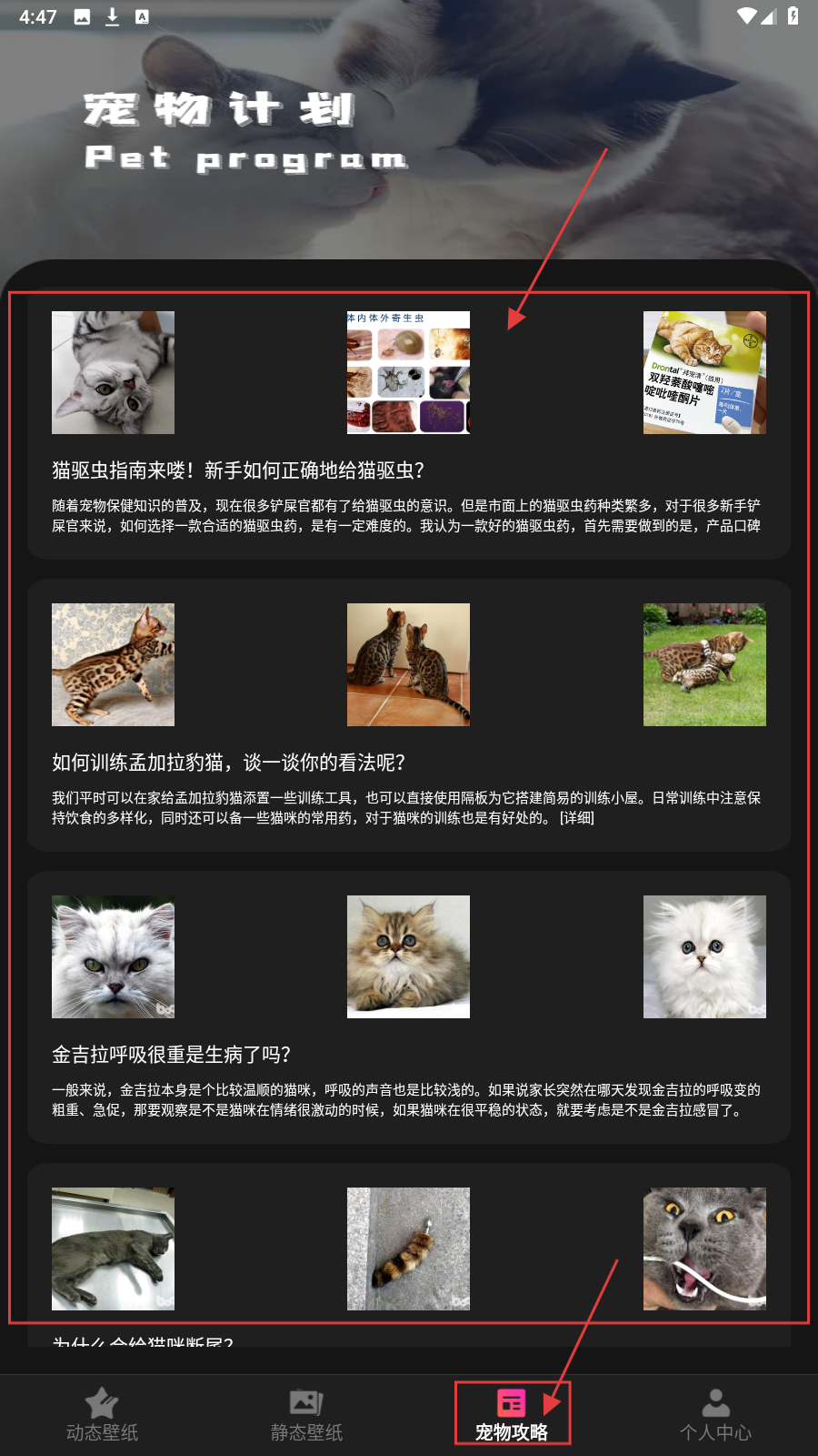 4、点【宠物攻略】,阅读宠物知识文章(如猫驱虫指南、豹猫训练、金吉拉健康),了解养宠技巧。