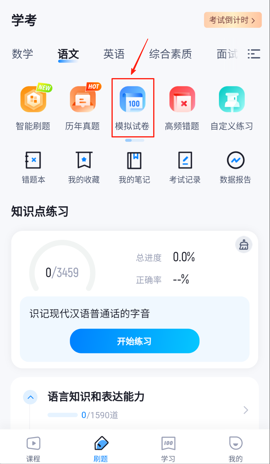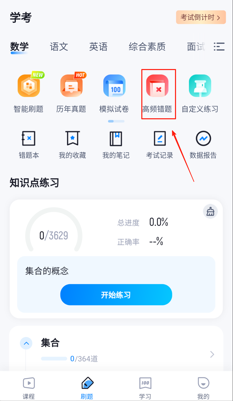 1、首页点"智能刷题"选择学科科目,红点标注高频考点,设置题目数量,开始专项训练哦。