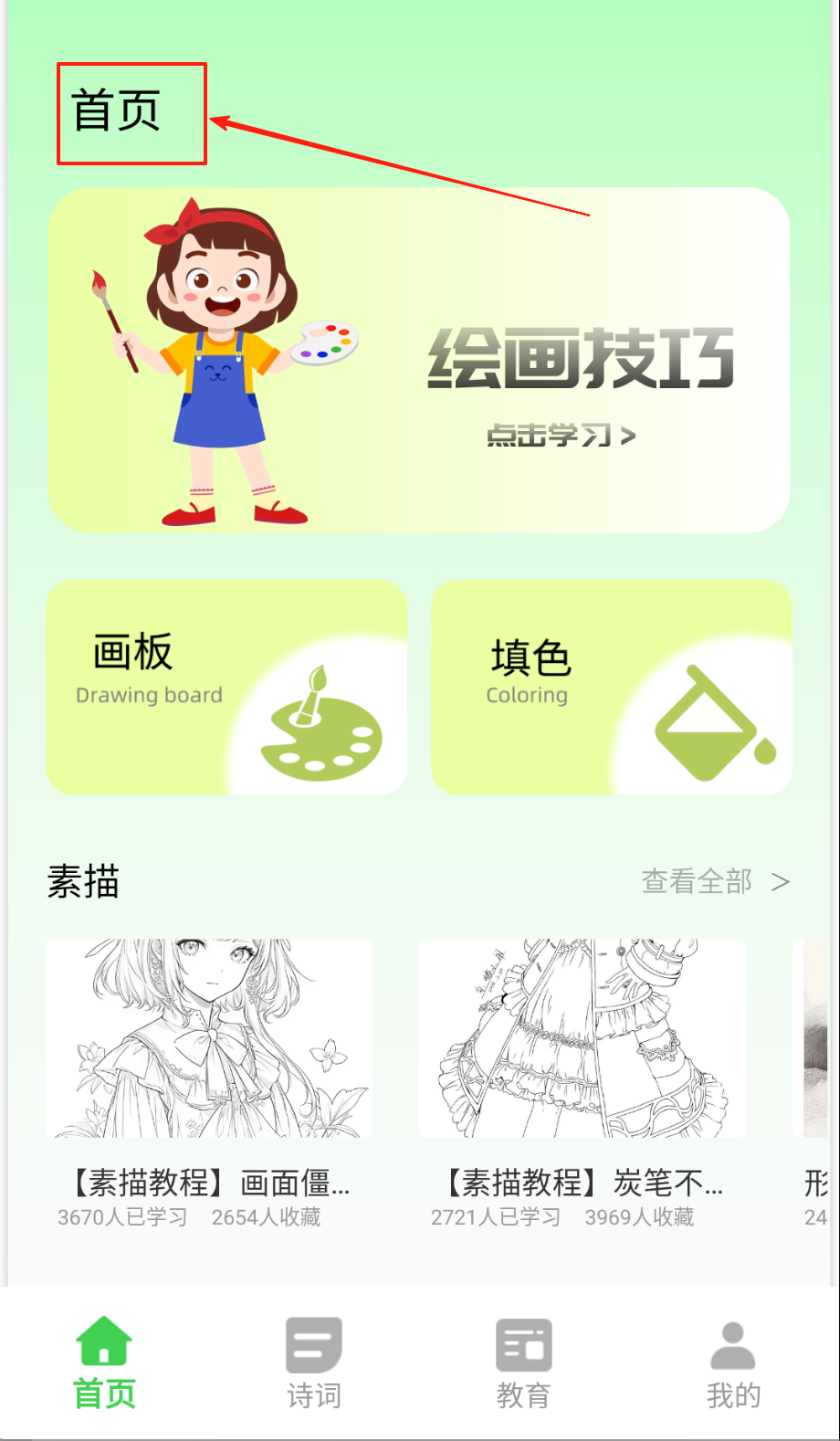 2、学习页观看教学视频,完成随堂练习,提交绘画作品,接收老师点评啦。
