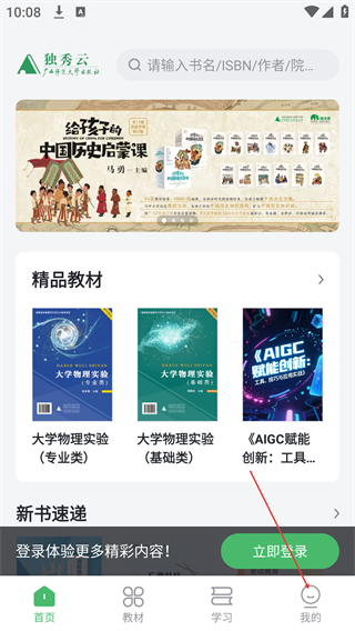 1、首页点"教材库"浏览推荐书目,红点标注新上教材,按学科分类筛选,查看详细简介哦。
