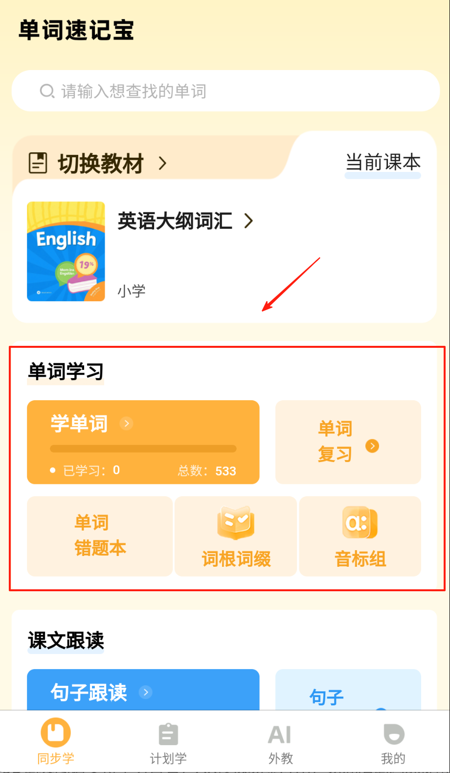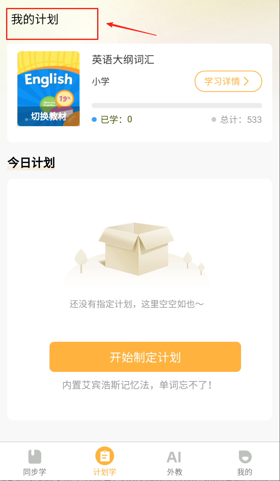 1、首页点"今日计划"查看学习任务,红点标注新词提醒,选择记忆模式,开始单词学习哦。
