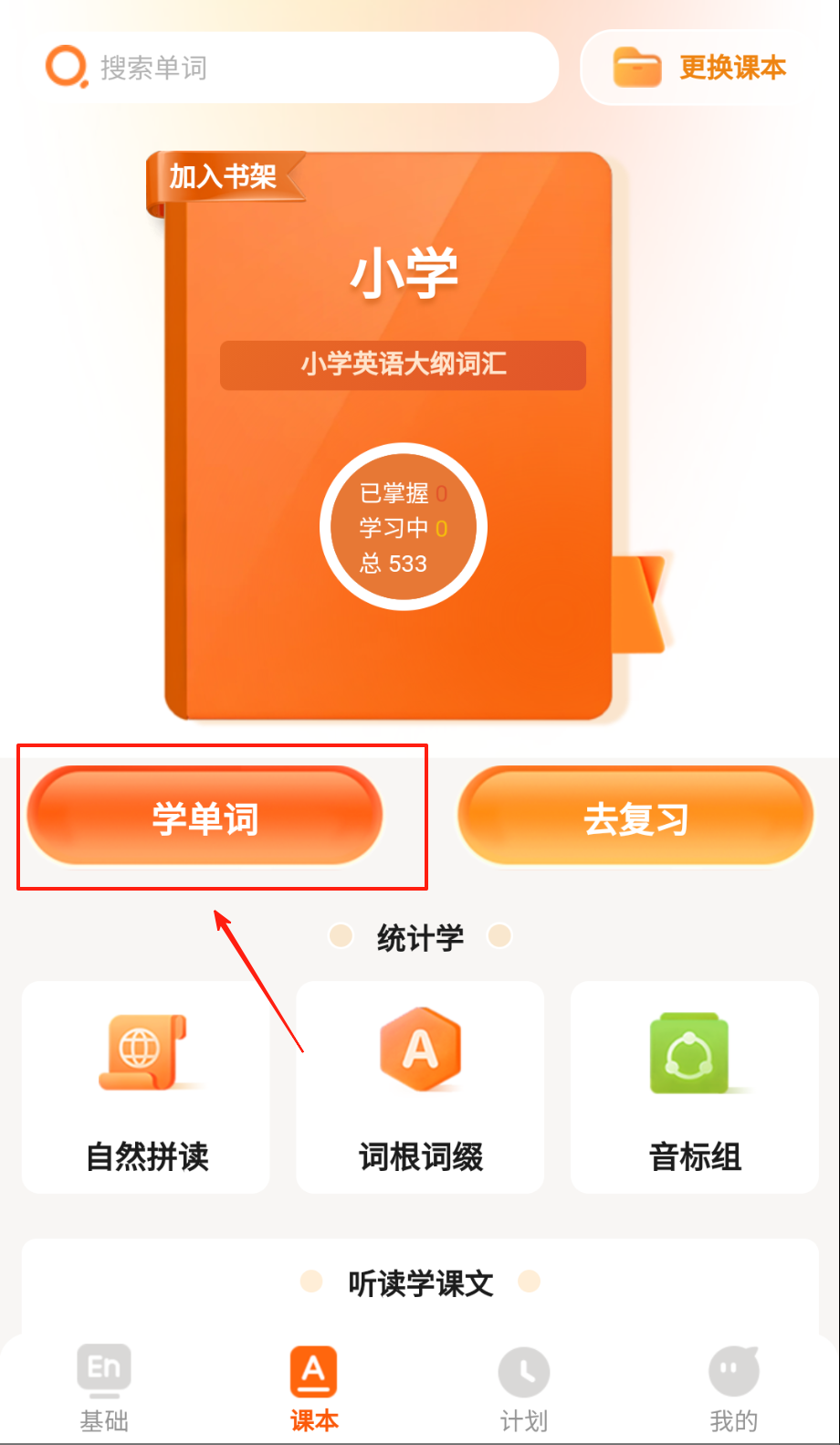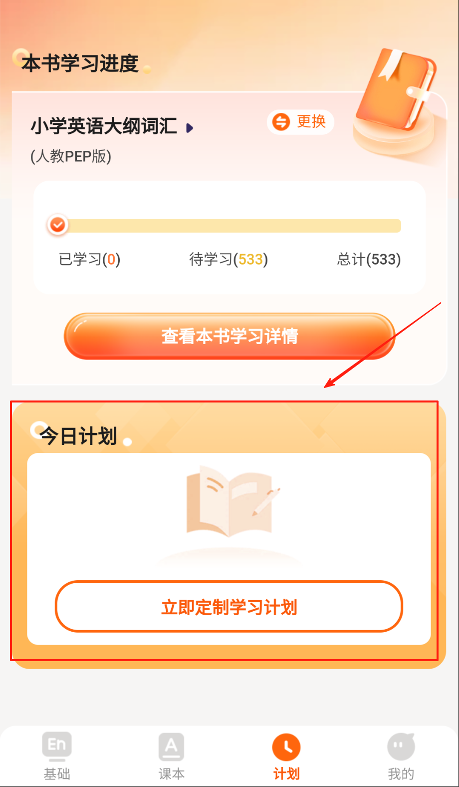 1、首页点"今日计划"查看学习任务,红点标注新词提醒,选择记忆模式,开始单词学习哦。