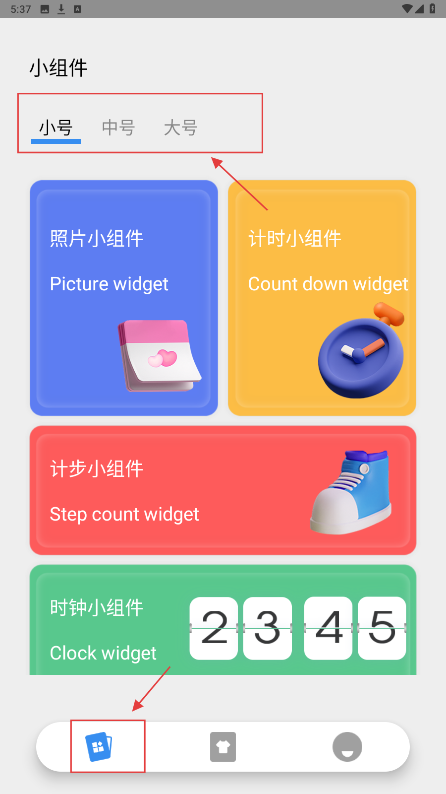 1、在【小组件】页,选【小号】【中号】【大号】尺寸,挑【照片】【计时】【计步】【时钟】小组件。