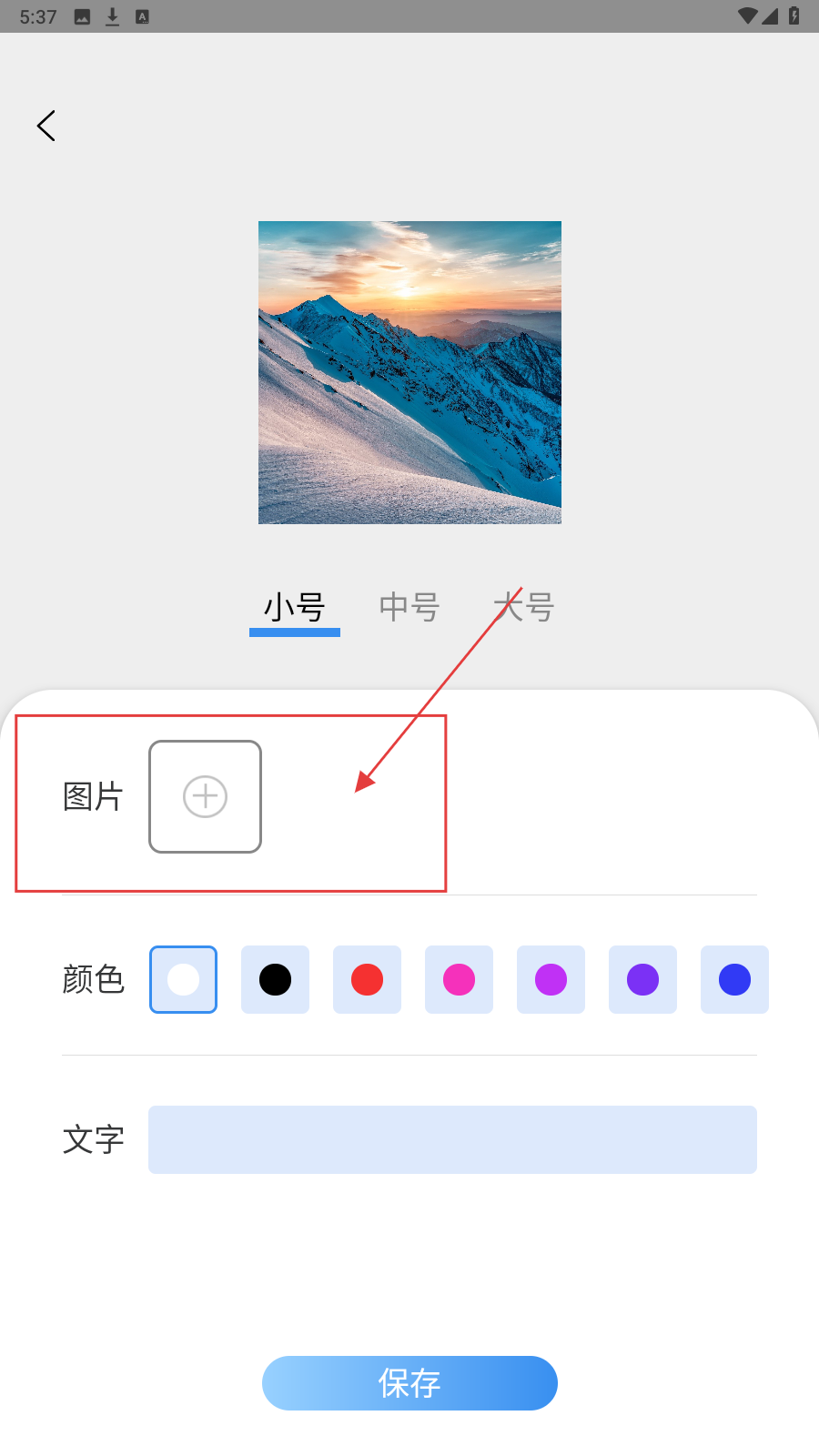 2、选【照片小组件】,点【图片】区“+”号,从相册选图(如雪山日落),设为组件背景。