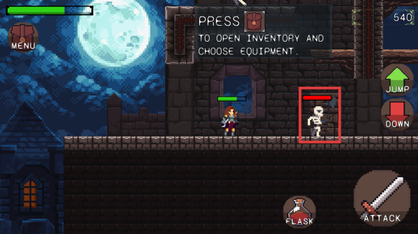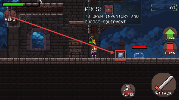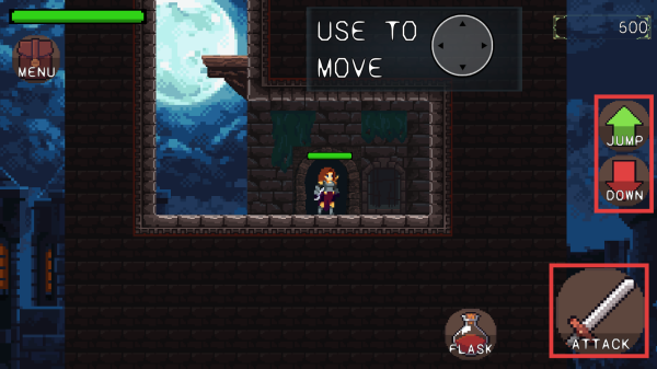 1、熟悉操作,利用虚拟摇杆控制角色移动,通过右边的两个按键实现跳跃和下蹲动作,遭遇敌人时,及时按【ATTACK】键攻击。