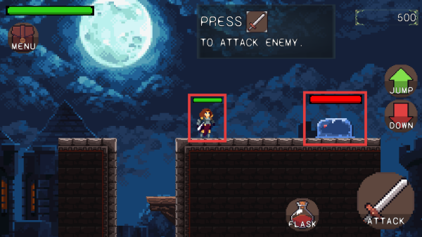 2、如图遭遇到敌人【史莱姆】,注意双方的血量,采取不同的攻击策略,把握时机可有效打击敌人。