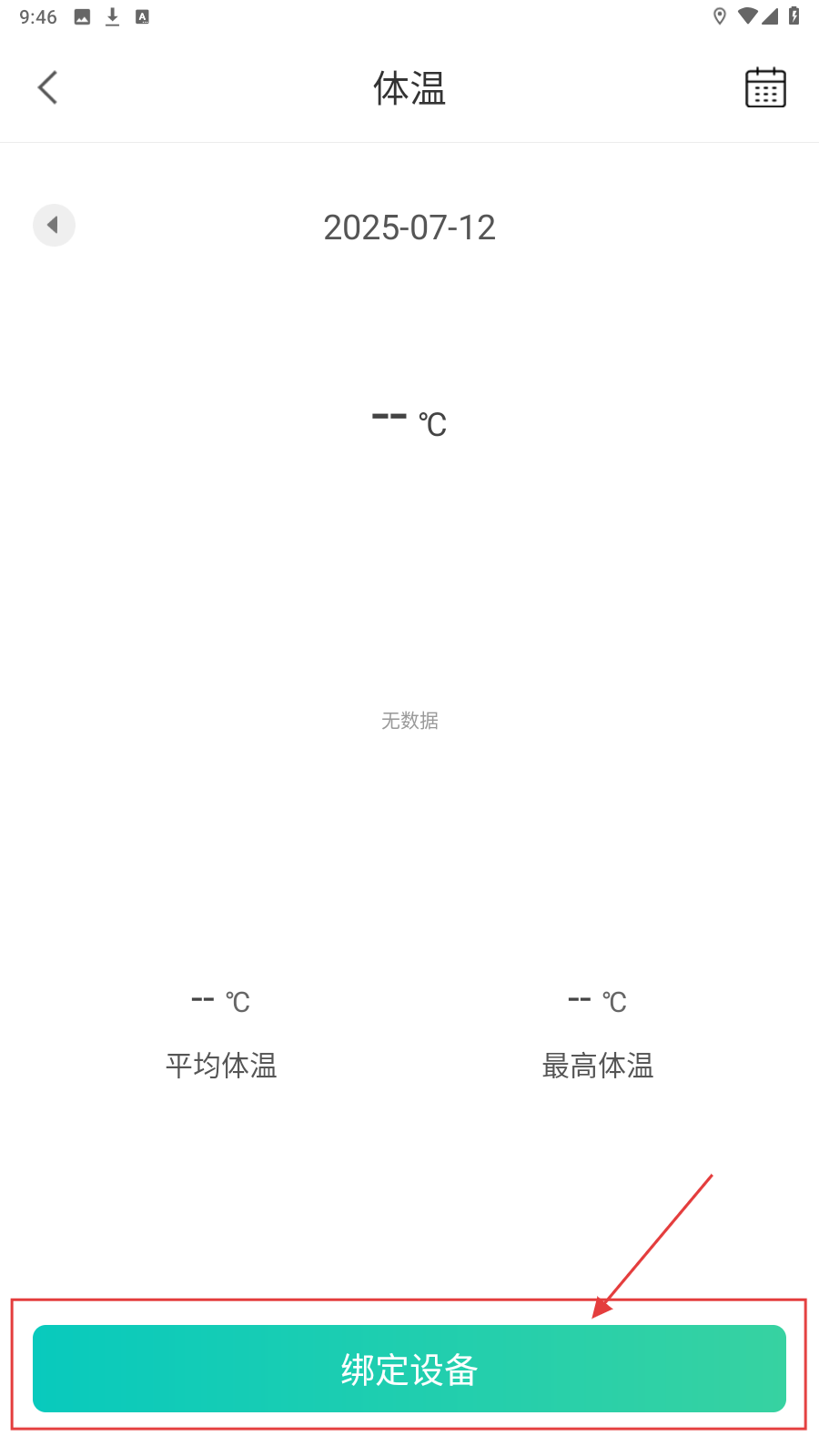 2、点击【体温】选项,可查看当天体温数据,若未绑定设备,可点击【绑定设备】进行绑定。