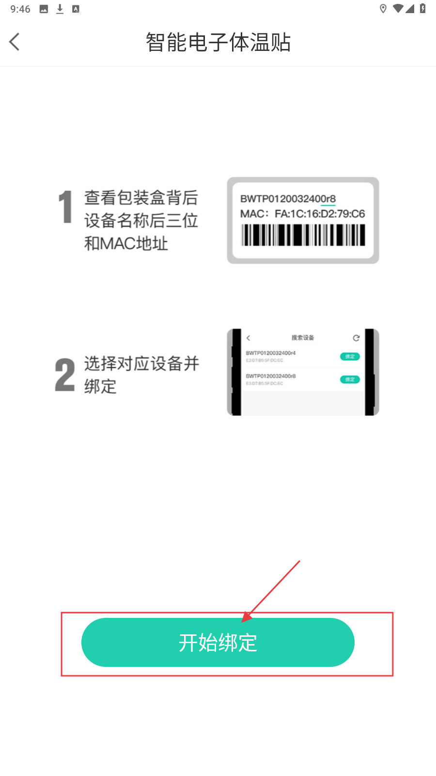 3、在【智能电子体温贴】绑定页面,按提示查看设备信息并点击【开始绑定】,完成设备绑定。