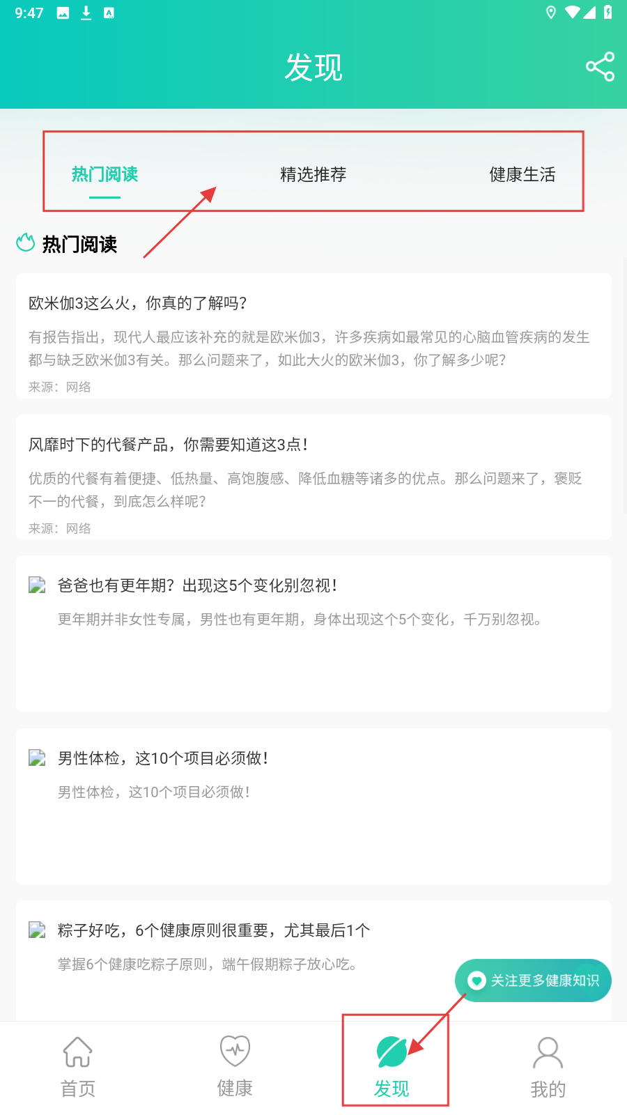 4、进入【发现】页面,可浏览热门阅读、精选推荐、健康生活等板块,获取健康知识。
