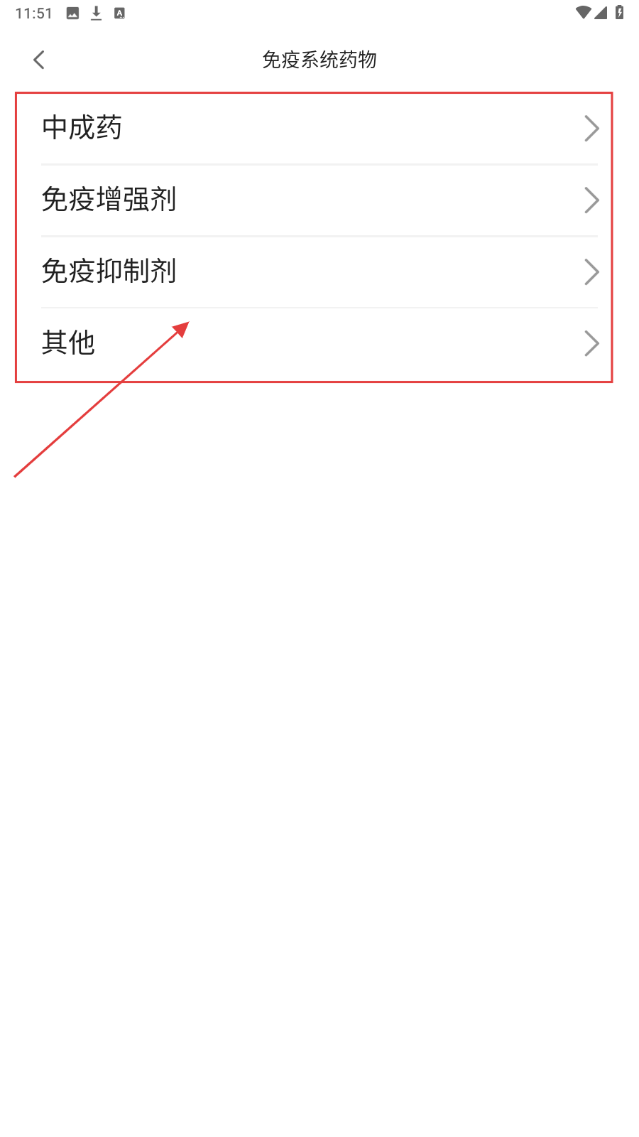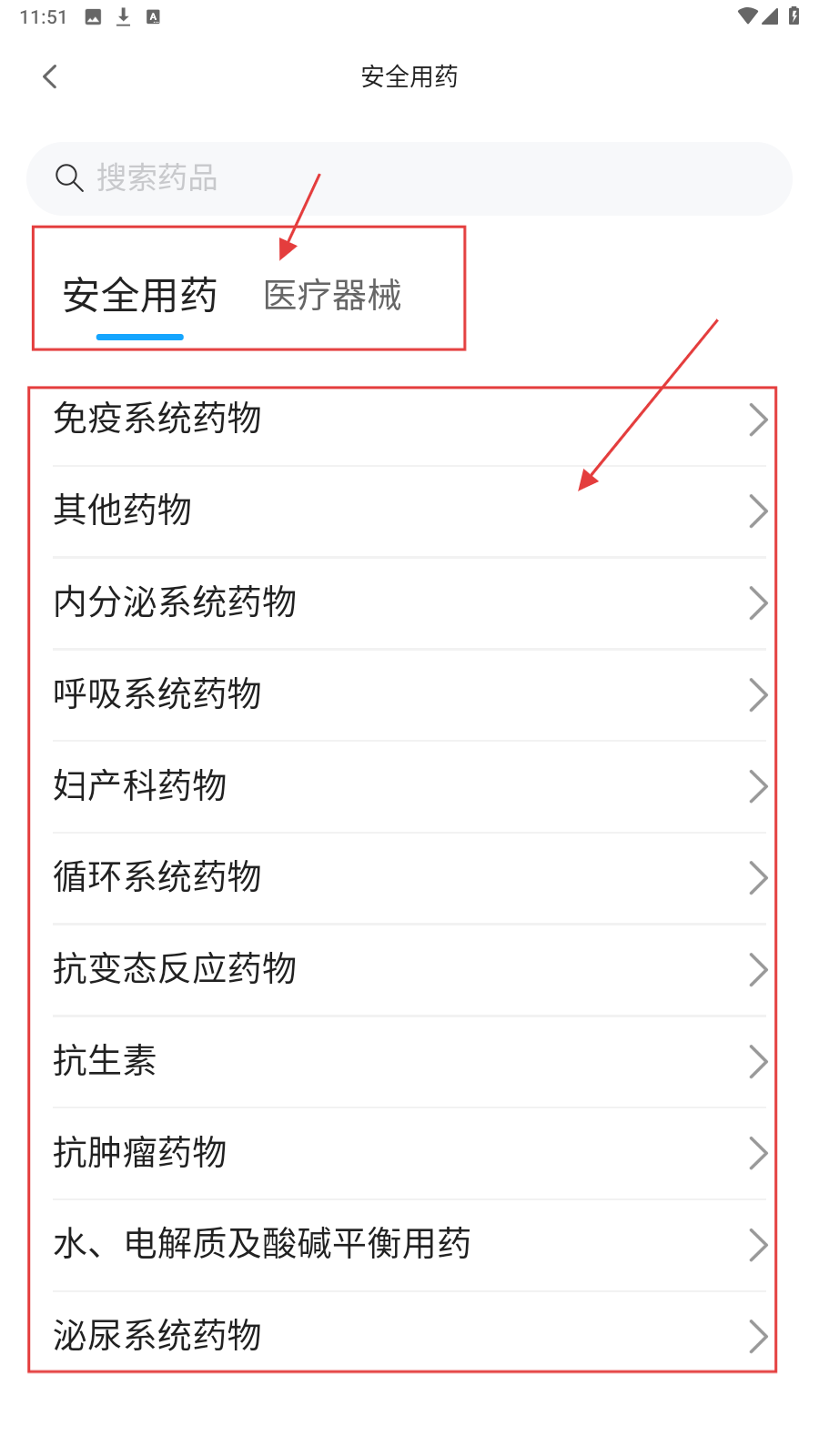 1、打开应用,可以选择【安全用药】或者【医疗器械】大类,在类目下方选择需要查询的药品类型。
