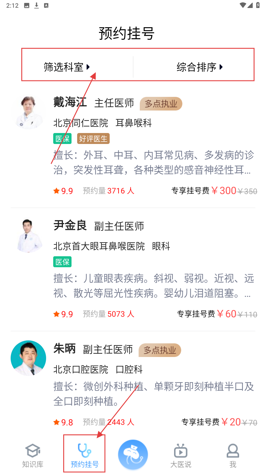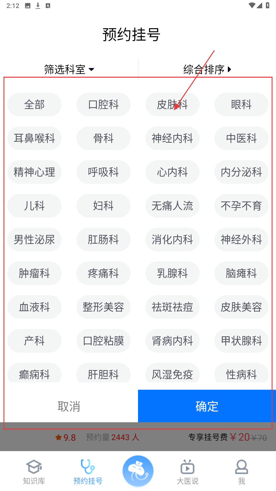 1、进入【预约挂号】页面,可看到【筛选科室】和【综合排序】功能,点击可进行筛选和排序。
