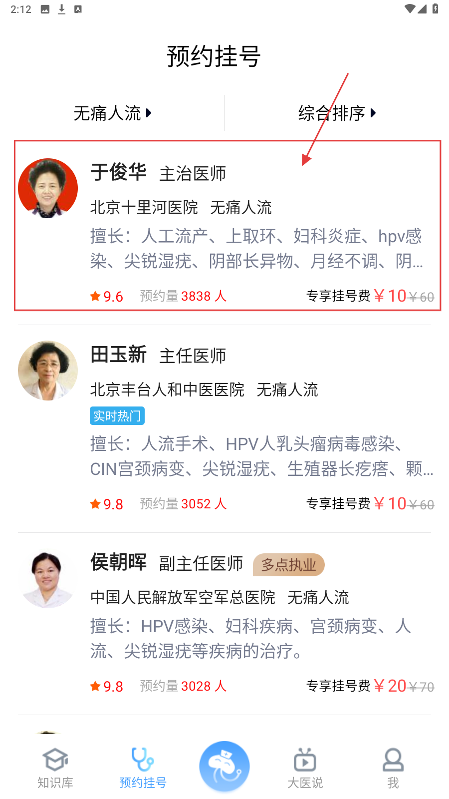3、选择科室后,查看对应科室的医生列表,点击医生进入医生详情页面。