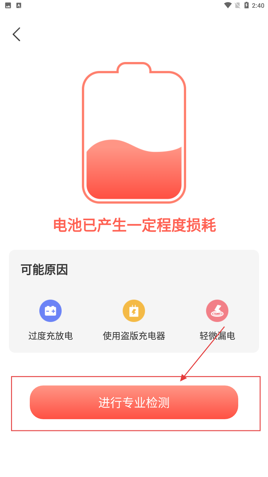 2、在电池损耗提示页面,点击【进行专业检测】,可对电池进行全面检测。