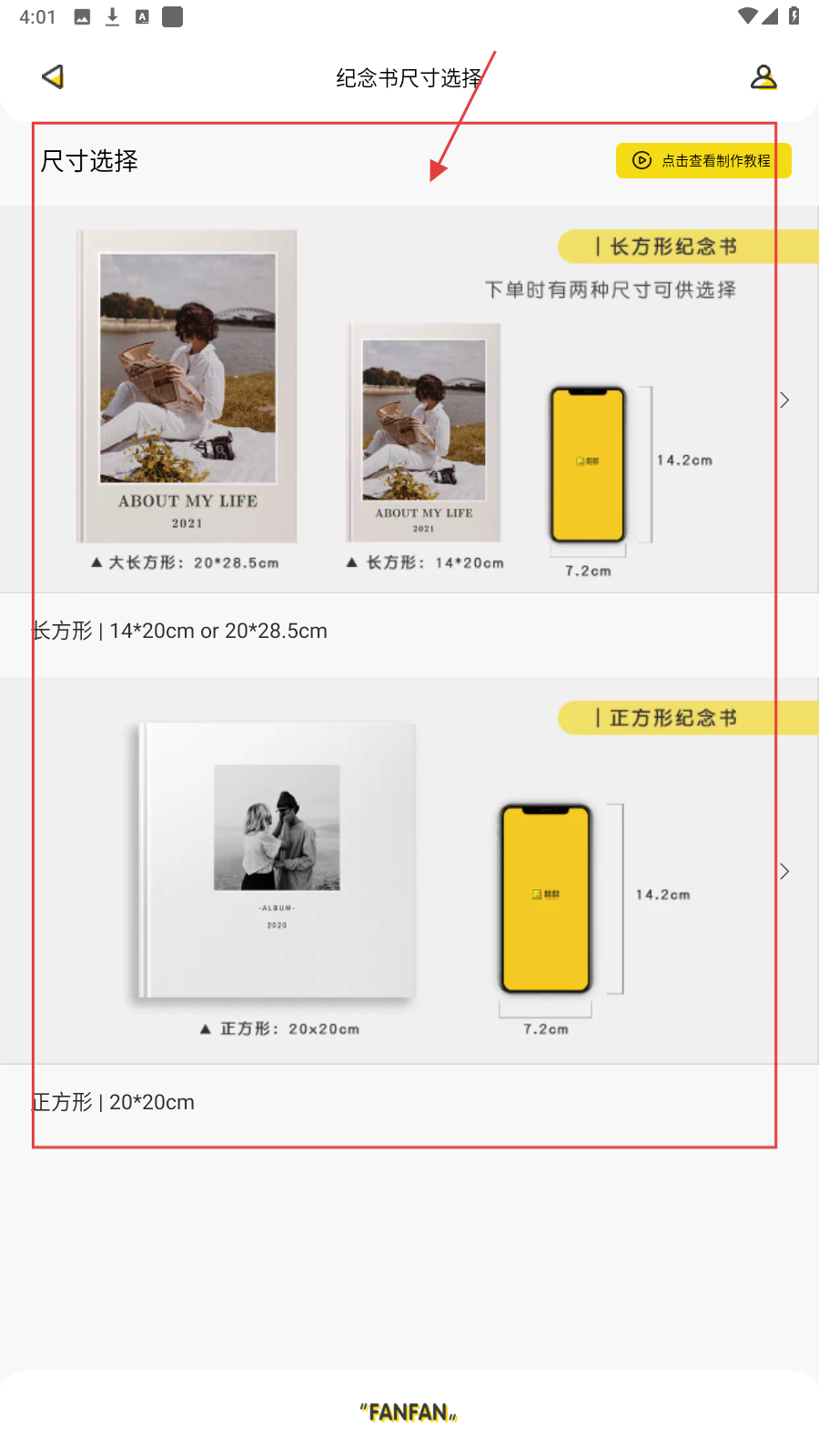 2、在【纪念书尺寸选择】页面,可选择不同尺寸的纪念书,根据需求进行选择。