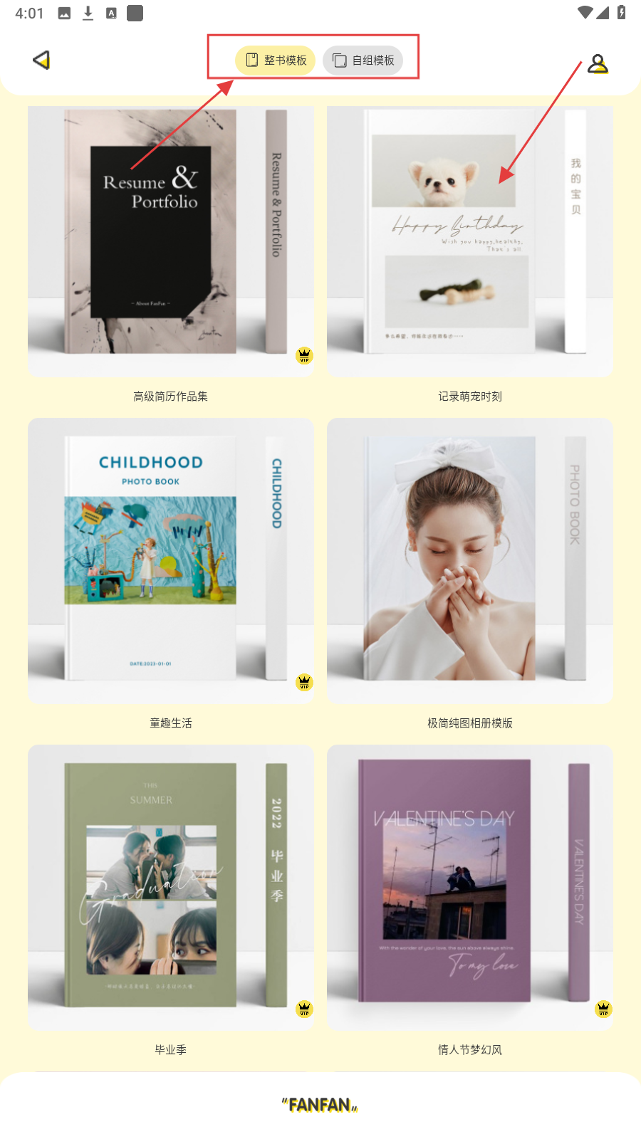 3、在模板选择页面,可选择【整书模板】或【自组模板】,根据喜好选择合适的模板。