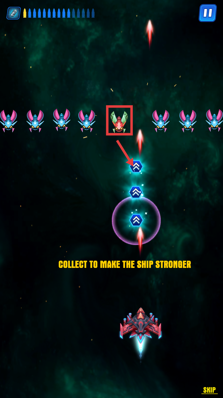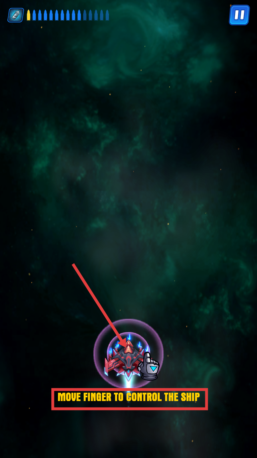 1、按照提示,通过移动手指操控飞船,左右上下移动,躲避并攻击敌人。