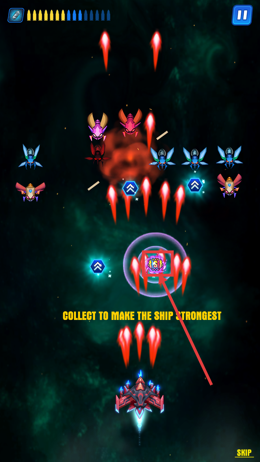2、在飞行过程中,击败敌人可以获得道具,用来增强飞船能力。