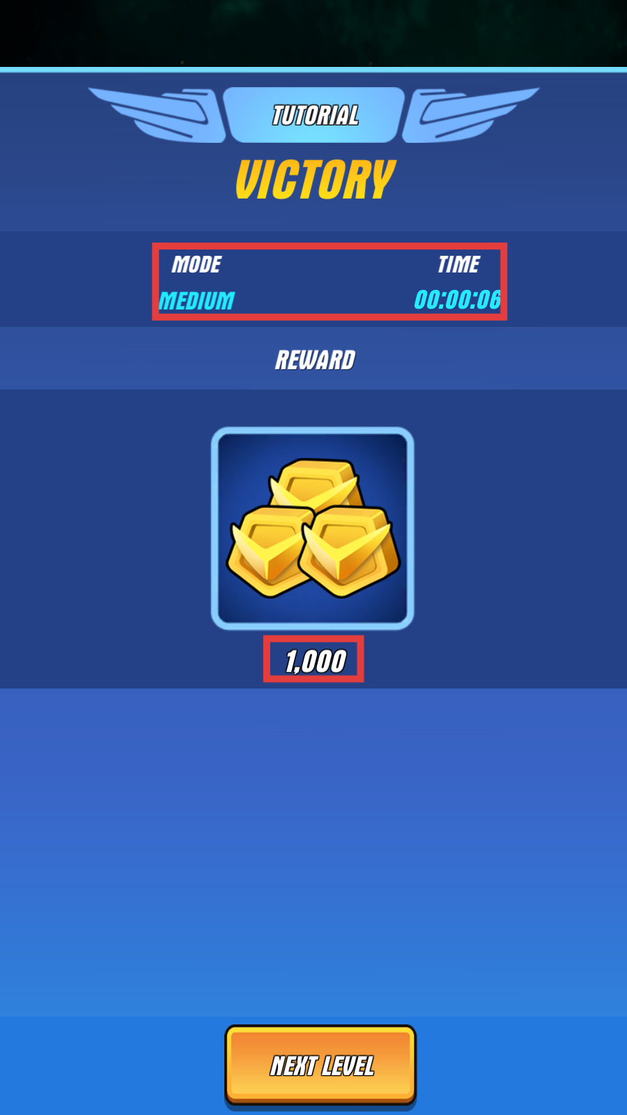 4、关卡胜利后,查看奖励界面的(难度模式)、(通关时间)信息,领取1000金币奖励,点击进入下一关。