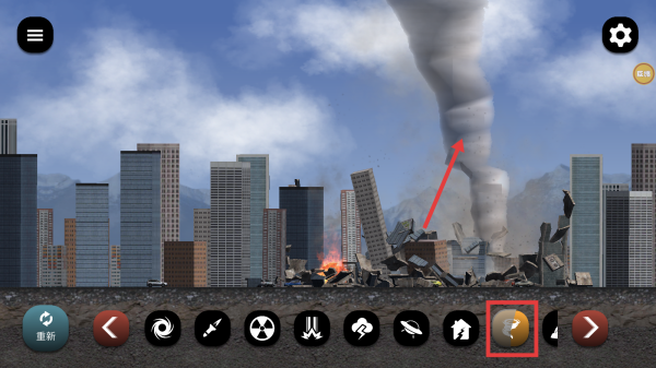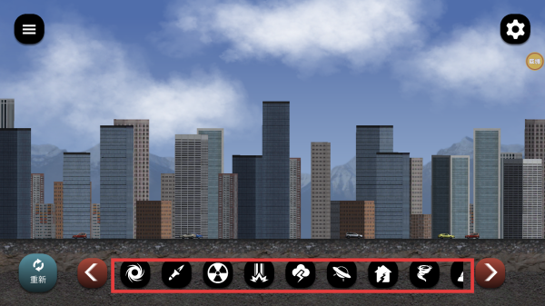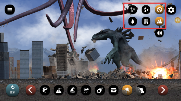 3、留意右上角功能图标,适时使用天气、环境等功能,丰富破坏场景和效果。