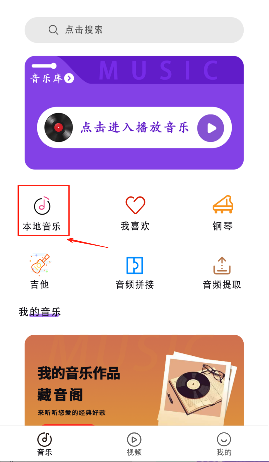 1、首页点"本地音乐"导入音频文件,红点标注新添加歌曲,按类型筛选,设置播放列表哦。