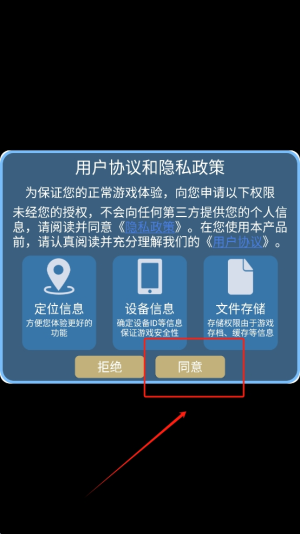 1、授权权限:在“用户协议和隐私政策”界面,点击“同意”按钮,授予定位、设备信息与文件存储权限以继续游戏。