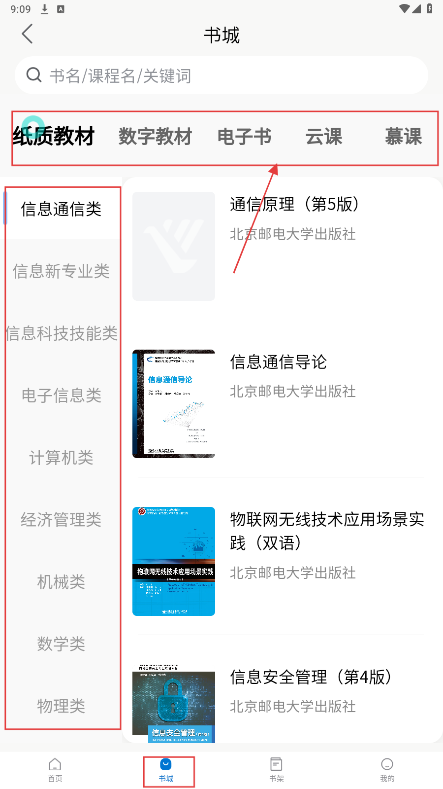 1、在【书城】页面,可按【纸质教材】【数字教材】等分类查找图书,也可通过搜索框搜索图书。
